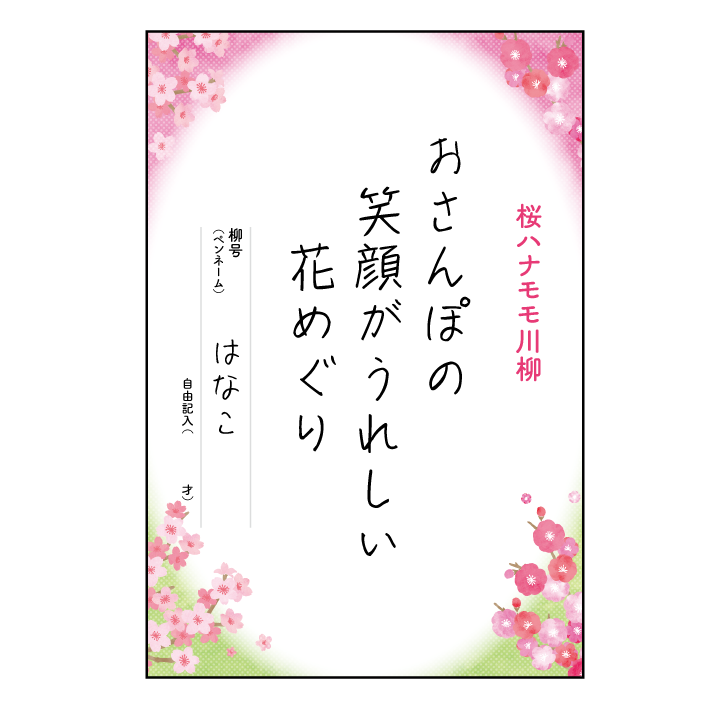 応募台紙、またはハガキ大の紙にご自分で作った川柳とペンネームをご記入ください。