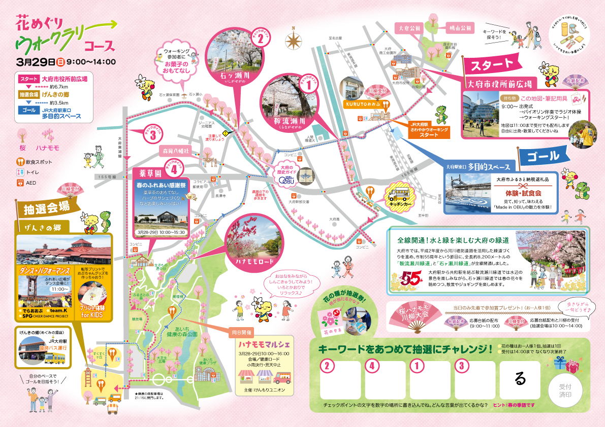 お花見スポットを巡り、キーワードを集めながら往復約10kmのコースを歩きます。
